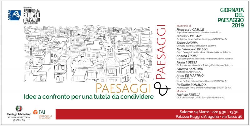 giornatanazionalepaesaggio2019 In occasione della GIORNATA DEL PAESAGGIO organizzata dal MiBAC (Ministero per i beni e le attività culturali), prevista per giovedì 14 marzo, le Soprintendenze aprono i loro uffici con iniziative di sensibilizzazione e di riflessione sul tema del paesaggio, illustrando l'attività svolta a favore del paesaggio. La Soprintendenza ABAP di Salerno e Avellino, diretta da Francesca Casule, partecipa con le seguenti iniziative.