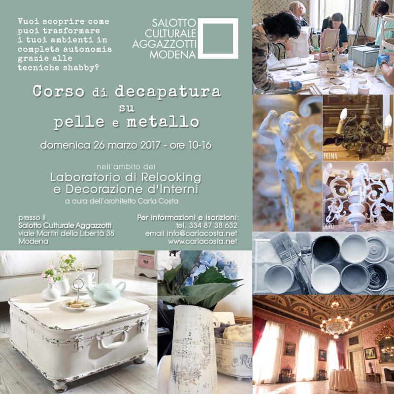 In questo corso scoprirai come personalizzare la tecnica della decapatura, caratteristica dello stile shabby, applicandola su due importanti categorie dell’arredo d’interni: gli arredi ed i complementi in pelle ed in metallo, materiali che necessitano di conoscenze e azioni di recupero specifiche. Imparerai con semplicità come rinnovare poltrone, sedie, borse, valige, lampadari, applique, candelabri, ecc.