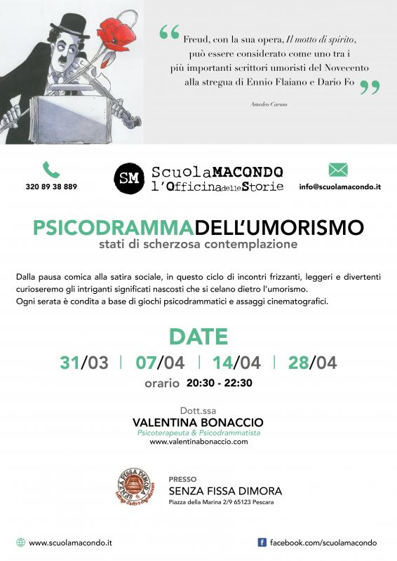 Venerdì 31 marzo, presso il locale Senza Fissa Dimora a Pescara, la Scuola Macondo – l'Officina delle Storie darà il via a un ciclo di quattro incontri gratuiti sullo Psicodramma dell’umorismo, un nuovo approccio per riflettere sui significati psichici profondi che si celano dietro l’umorismo e le sue dinamiche.