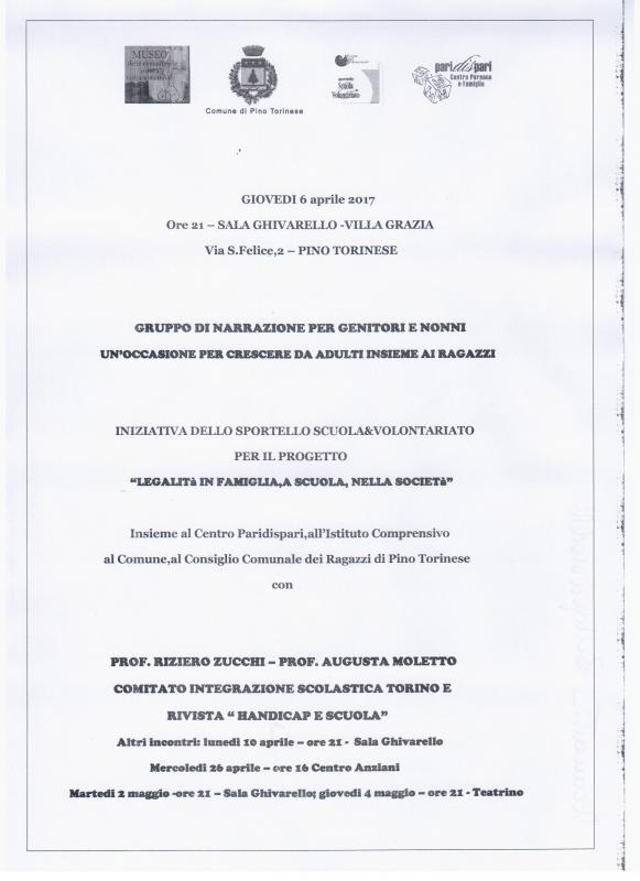 Il primo incontro per gli adulti sarà tenuto il 6 aprile -ore 21 -Sala Ghivarello -Via s.Felice, 2 - Pino Torinese.