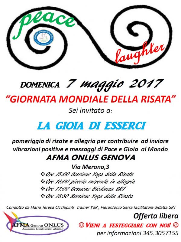 AFMA GENOVA ONLUS OSPITA, DOMENICA 7 MAGGIO 2017 A PARTIRE DALLE ORE 15,00 LA MANIFESTAZIONE "GIORNATA MONDIALE DELLA RISATA"