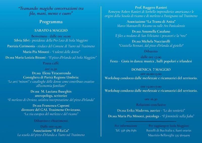 Il pomeriggio, dalle ore 15.30, offre l’occasione per ascoltare il racconto dell’introduzione e dell’evolversi dell’arte del merletto al Trasimeno. Le associate del “E.Es.Co." parleranno della scuola di pizzo d’Irlanda a Tuoro. Con Ruggero Ranieri si rivivrà la creazione a Passignano della scuola di ricamo fondata dall’americana Romeyne Robert Ranieri di Sorbello. Del ricamo su tulle Ars Panicalensos, di cui si possono ammirare alcuni stupendi manufatti nel museo allestito a Panicale, parlerà Marco Mannarelli dell’associazione “La trama di Anita”. Gli interventi di Antonella Catalano sul filet modano di San Feliciano e di Antonella Catalano sull’utilizzo del pizzo d’Irlanda per la realizzazione di gioielli chiudono le relazioni della prima giornata che prosegue con una festa di musiche e danze irlandesi.