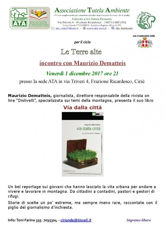 Venerdì 1 dicembre 2017, alle 21, presso la sede ATA di via Triveri 4, nell’ambito del ciclo “Le Terre alte” si terrà la serata, promossa da ATA e sostenuta dal Comune di Cirié, con Maurizio Dematteis, giornalista e direttore responsabile della rivista on line “Dislivelli”. Durante la serata, l’autore presenterà il suo libro “Via dalla città”, un reportage sui giovani che hanno lasciato la vita urbana per andare a vivere e lavorare in montagna.