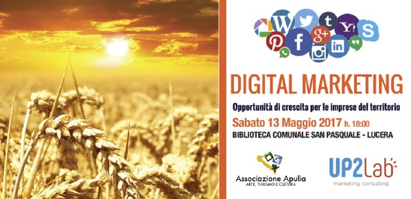 L’Associazione ‘Apulia Arte, Turismo e Cultura’ ha organizzato per sabato 13 maggio alle ore 18, presso la Biblioteca San Pasquale di Lucera, un incontro sul tema del ‘Digital Marketing e nuovi sistemi di comunicazione, opportunità di crescita per i professionisti e le imprese del territorio’.