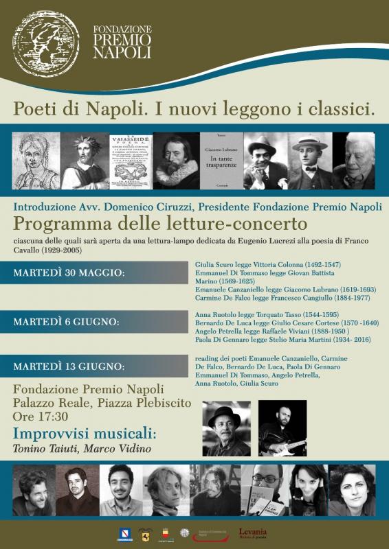 Tre pomeriggi di letture-concerto a Palazzo Reale, nella sede della Fondazione Premio Napoli, con inizio alle 17,30. Otto poeti campani di trent’anni alle prese con otto poeti della tradizione partenopea remota, recente e recentissima. Con gl’improvvisi musicali di Tonino Taiuti e di Marco Vidino, due artisti che le tradizioni le bruciano al fuoco della contemporaneità.