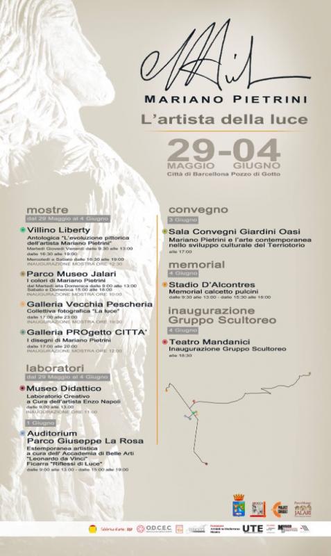 l'Artista della Luce" è organizzata con il patrocinio di Galleria PROgetto CITTÀ, Parco Museo Jalari, Museo Didattico, Fabbrica D'Arte 332, Accademia delle Belle Arti "Leonardo Da Vinci" di Ficarra, Ordine degli Architetti P.P.C. di Messina, Fondazione degli Architetti del Mediterraneo, Consulta Regionale degli Architetti, Ordine dei Dottori Commercialisti e degli Esperti Contabili di Barcellona Pozzo di Gotto, UTE Barcellona Pozzo di Gotto e Studio Luce.