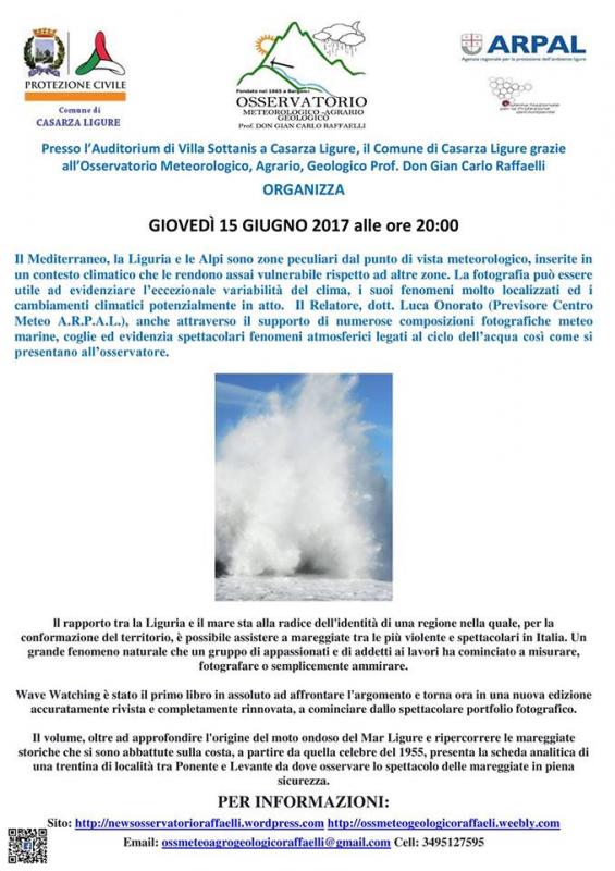 ORGANIZZA GIOVEDÌ 15 GIUGNO 2017 alle ore 20:00Il Mediterraneo, la Liguria e le Alpi sono zone peculiari dal punto di vista meteorologico, inserite in un contesto climatico che le rendono assai vulnerabile rispetto ad altre zone. La fotografia può essere utile ad evidenziare l’eccezionale variabilità del clima, i suoi fenomeni molto localizzati ed i cambiamenti climatici potenzialmente in atto. Il Relatore, dott. Luca Onorato (Previsore Centro Meteo A.R.P.A.L.), anche attraverso il supporto di numerose composizioni fotografiche meteo marine, coglie ed evidenzia spettacolari fenomeni atmosferici legati al ciclo dell’acqua così come si presentano all’osservatore.ll rapporto tra la Liguria e il mare sta alla radice dell'identità di una regione nella quale, per la conformazione del territorio, è possibile assistere a mareggiate tra le più violente e spettacolari in Italia. Un grande fenomeno naturale che un gruppo di appassionati e di addetti ai lavori ha cominciato a misurare, fotografare o semplicemente ammirare.Wave Watching è stato il primo libro in assoluto ad affrontare l'argomento e torna ora in una nuova edizione accuratamente rivista e completamente rinnovata, a cominciare dallo spettacolare portfolio fotografico.Il volume, oltre ad approfondire l'origine del moto ondoso del Mar Ligure e ripercorrere le mareggiate storiche che si sono abbattute sulla costa, a partire da quella celebre del 1955, presenta la scheda analitica di una trentina di località tra Ponente e Levante da dove osservare lo spettacolo delle mareggiate in piena sicurezza.