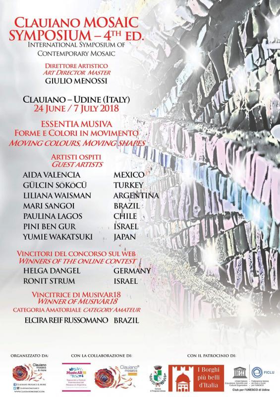 Dopo il successo delle edizioni precedenti, i portali dell’Art Exhibition Gallery sono lieti di ospitare la 4° edizione del “Simposio Internazionale di Mosaico Contemporaneo” di Clauiano: dal 24 giugno al 7 luglio dieci mosaiciste internazionali, provenienti da diversa formazione, si metteranno ancora alla prova per promuovere l’antica tecnica musiva, nonché per esibire le loro abilità attraverso dedizione e fantasia. Un momento di dialogo fra le artiste, coordinate ancora dal “maestro d’orchestra” Giulio Menossi. Curiosi e appassionati sono invitati a visitare il loro atelier dal 25 GIUGNO al 7 LUGLIO dal lunedì al venerdì, ore 10-12 e 14-17 (gradita prenotazione) a Clauiano, via della Filanda 1; il 28 GIUGNO, ore 18.30, a Udine (P.zza Belloni 9), in occasione del “Giovedì dell’arte di Azimut” il pubblico potrà assaporare il mondo del mosaico con le opere e le artiste; il 7 LUGLIO, ore 19.30, il “Galà del Symposium” presenterà e premierà con entusiasmo i lavori (presso Villa Manin Guerresco a Clauiano).