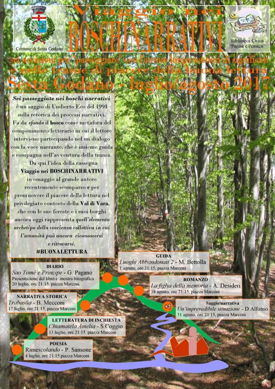 Il calendario degli eventi della rassegna Viaggio nei BOSCHI NARRATIVI si compone di sei appuntamenti "+1" con l'autore in cui saranno presentate sei opere letterarie, spaziando dal genere poetico alla letteratura di inchiesta, fino al romanzo. Gli incontri si svolgeranno in piazza Marconi, a Sesta Godano, ai piedi del Monte Gottero, la cui origine toponomastica alcuni vorrebbero ricollegare al dio Wotan, il germanico Odino, che guidò gli uomini e gli dei contro le forze del caos e la cui sapienza è magia e poesia al tempo stesso.