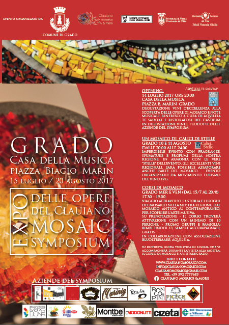 Dopo il meraviglioso successo del Secondo Simposio di Mosaico Contemporaneo di Clauiano, che ha visto nove artiste realizzare con grande maestria dei pezzi di mosaico unici presso le sale dell'Art Exhibition Gallery, anche il Comune di Grado sarà lieto di accogliere il mirabile evento. Il mosaico "del vino" sarà ospite della Laguna presso la Casa della Musica (Piazza Biagio Marin) a partire dal 15 luglio e fino al 20 agosto. L' inaugurazione di venerdì 14 luglio (dalle ore 20.00) darà il via alla mostra d'arte, che sarà aperta al pubblico ogni sera dalle ore 19.30 alle 22.30. Presenti all'inaugurazione diverse aziende vinicole del Collio e di Prepotto che hanno portato il loro prezioso contributo. Una seconda edizione da non perdere quella del Simposio, che unisce, sotto un'unica dimensione, sapori, cultura e territorio.