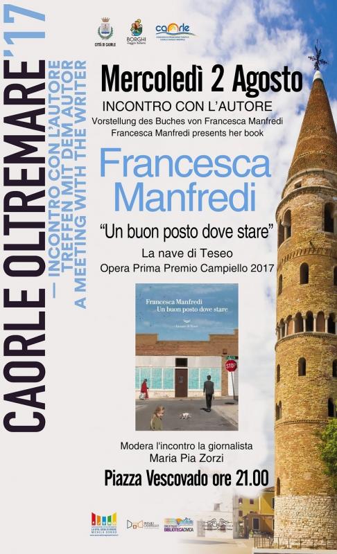 La vincitrice del Premio Campiello Opera Prima 2017, Francesca Manfredi, presenterà il suo esordio narrativo “Un buon posto dove stare” mercoledì 2 agosto 2017 alle 21.00 in Piazza Vescovado a Caorle (VE), nell’ambito degli “Incontri con l’Autore” prevista all’interno di Caorle Oltremare.