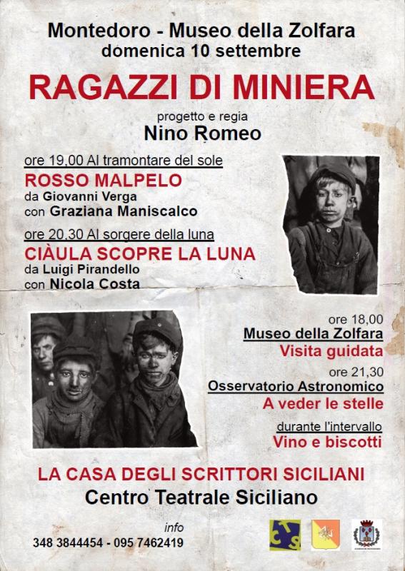 Il 10 settembre nell’ampio piazzale del Museo della Zolfara prospiciente la vallata in cui si incunea il paese, metteremo a confronto due carusi di miniera: il verghiano Rosso Malpelo e il pirandelliano Ciàula, accomunati dalla condizione di schiavitù del lavoro in miniera ma distanti nel tempo (circa un trentennio separa le stesure delle due novelle) e per temperamento.