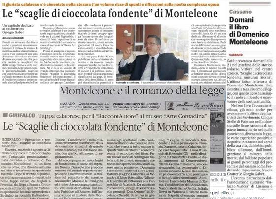 Il «Raccontautore», lo SHOW, l’originale presentazione di un libro che va oltre, che diventa esibizione, che si trasforma in spettacolo teatrale. Al centro dell’evento teatrale, l’opera di Domenico Monteleone, «Scaglie di cioccolata fondente – smisurati ritorni» (edito da Il Seme Bianco – Castelvecchi), nella quale si affrontano i diversi temi della drammatica attualità di questo inizio di secolo, ma lo si fa con ironia, con garbo, attraverso il ragionamento. Si comincerà, come detto, il 3 agosto a Crotone, per poi proseguire in tutta la Regione, da Girifalco (8 agosto) a Lunigro (9 agosto), da Palmi (10 agosto) a Frascineto (11 agosto) e, infine, Rossano (21 agosto), Ferruzzano (25 agosto) ospiti della I Edizione del Grekanik Art Fest – Festival delle Arti dell’Area Grecanica jonica e Cassano sullo Ionio (28 agosto), Monterosi (VT) - Sala Polivalente - San Giovanni Paolo II (14 settembre)Ad accompagnare i monologhi di Monteleone, il canto del Soprano Nunzia Durante che propone canzoni del grande repertorio napoletano e canzoni inedite, la musica del pianoforte del Maestro Alessandro Massa e le immagini ed i video che accompagnano tutto l’excursus dello show. Dal Debito Pubblico all'Amore, dall'Immigrazione al mistero della Morte, dal Folklore popolare ai grandi Personaggi del presente e del passato come Ferdinando Imposimato, Nicola Gratteri e Giorgio Gaber.«L’obiettivo del libro coniugato in spettacolo teatrale – afferma l’autore, Domenico Monteleone – è quello di viaggiare insieme agli spettatori nelle continue oscillazioni del pendolo della vita, che svaria a tutto campo in questi “infiniti ritorni”, così come recita il sottotitolo del libro. Per un nuovo modo di coniugare tutte le arti in un solo momento che non è solo spettacolo ma vuole essere anche pensiero».