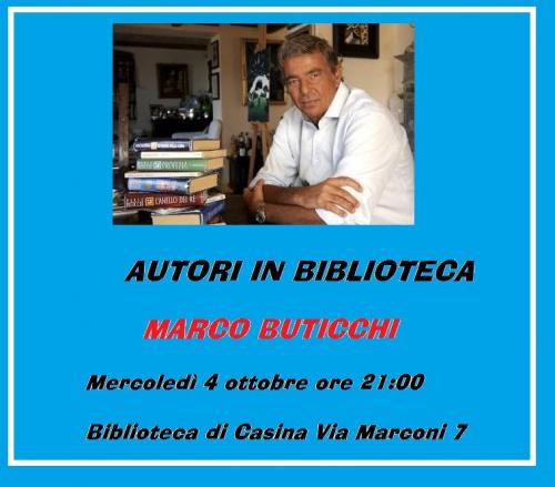 MercoledÌ 4 ottobre ore 21.00 lo scrittore Marco Buticchi incontrerà i suoi lettori nella biblioteca di CasinaScrittore italiano molto amato dal pubblico. Nel 1997 esce il suo primo romanzo Le Pietre della Luna edito da Longanesi. È un successo con 250.000 copie vendute in Italia e all’estero.Nel 1998 viene pubblicato nella stessa collana Menorah. Profezia, risale invece al Giugno del 2000 e L’Anello dei Re è pubblicato nel 2005.Tra gli altri titoli: Il vento dei demoni (2007) Il respiro del deserto (2009), La voce del destino (2011), Il respiro del deserto (2009), La voce del destino (2011), Il segno dell'aquila (2015), Casa di mare (2016). A breve uscirà il suo nuovo romanzo.