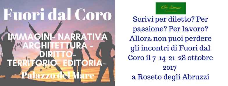 A Roseto degli Abruzzi il 7-14-21-28 ottobre 2017 si parlerà di editoria a 360°. Da un’idea della scrittrice Lorena Marcelli, ora anche presidente dell’associazione culturale/editoriale Elle Emme, è nato “Fuori dal Coro: Immagini, Narrativa, Architettura, Diritto, Territorio, Editoria”, una serie di incontri tematici che prenderanno avvio sabato 7 e si concluderanno sabato 28 ottobre con la mini fiera del libro e con una tavola rotonda sull’editoria Non a Pagamento.