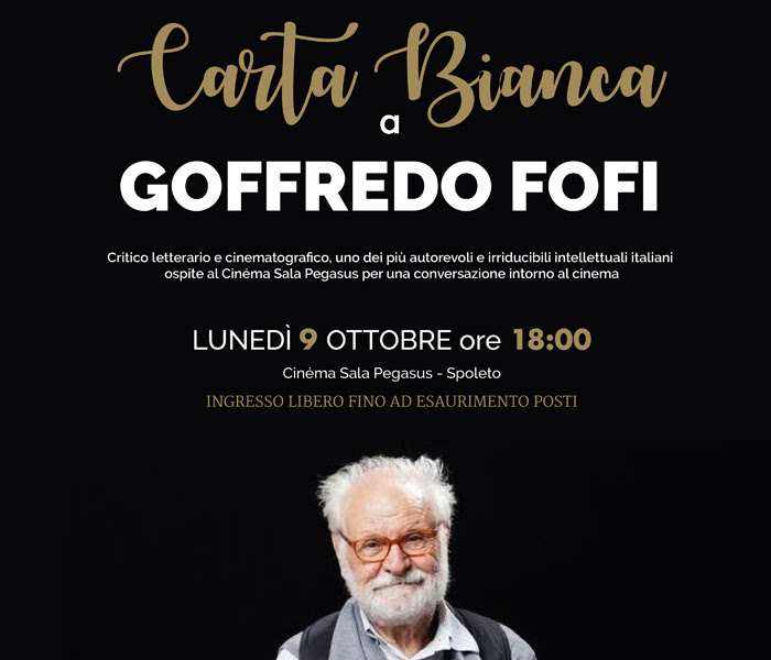 Uno dei più autorevoli intellettuali italiani, Goffredo Fofi, critico cinematografico, letterario, teatrale, sarà ospite alla Sala Pegasus, lunedì 9 ottobre alle ore 18, per una conversazione con il pubblico intorno al cinema, dal titolo “Carta Bianca a Goffredo Fofi”.