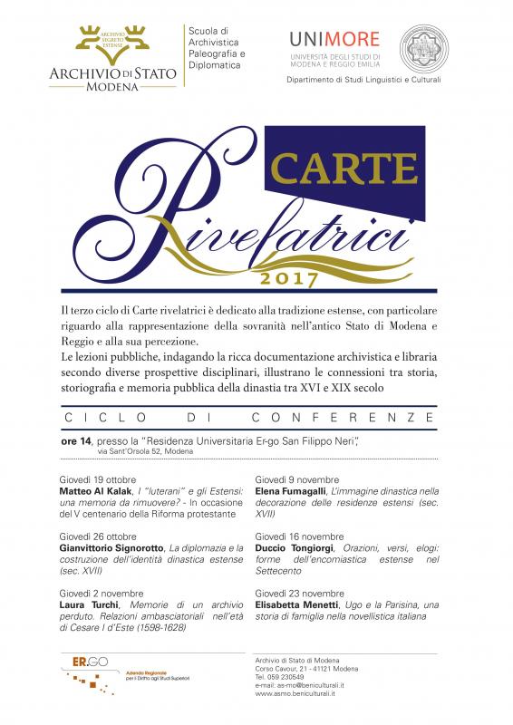 Da giovedì 19 ottobre e sino al 23 novembre 2017, l'Archivio di Stato di Modena e l'Università degli Studi di Modena e Reggio Emilia in collaborazione con la Fondazione San Filippo Neri, promuovono un nuovo appuntamento con il ciclo di conferenze “Carte rivelatrici”.