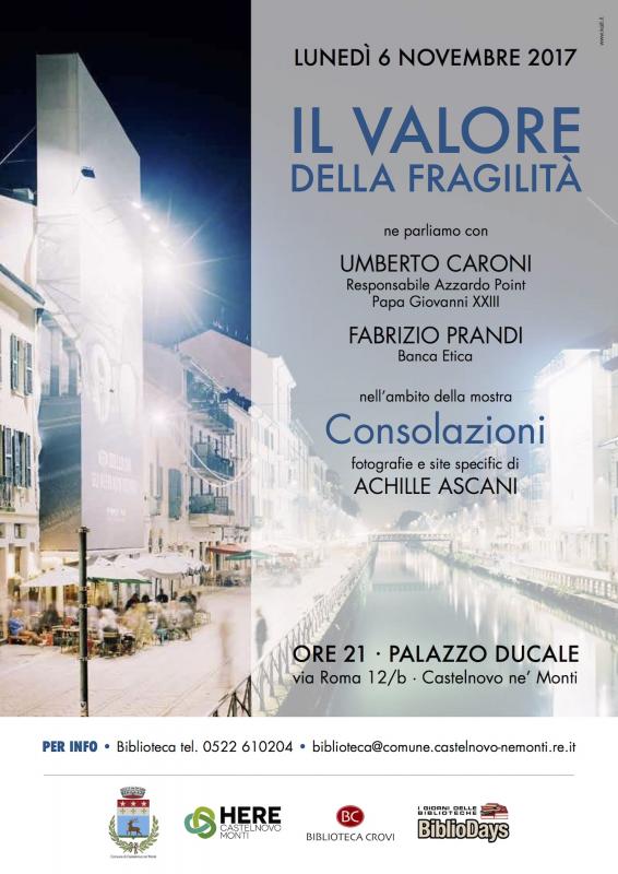 CASTELNOVO MONTI – Lunedì prossimo, 6 novembre, nell'ambito della mostra fotografica di Achille Ascani in corso a Palazzo Ducale, è in programma alle ore 21 nelle sale espositive un incontro sul tema “Il valore della fragilità”. Interverranno Umberto Caroni, responsabile dell'azzardo point dell'Associazione Papa Giovanni XXIII, e Fabrizio Prandi di Banca Etica.