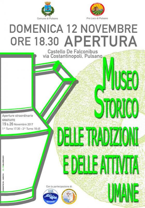 Riapre il museo della Civiltà Contadina a Pulsano, con una cerimonia inaugurale che si terrà Domenica 12 Novembre 2017 alle ore 18.30. In una nuova location, presso il primo piano del Castello De Falconibus e soprattutto in una veste del tutto rinnovata. L’organizzazione del Museo, infatti, è stata curata nei minimi particolari dalla locale Pro Loco e dai volontari esperti in archeologia che hanno collaborato sotto la guida del dottor Luca Adamo. Il museo ospita reperti della tradizione contadina con spazi dedicati alla olivicoltura, viticoltura ed alla coltivazione del grano. L’etichettatura dei reperti nel dialetto locale favoriranno la tutela della memoria storica ed immateriale dell’identità agricola e marinara del comune di Pulsano.La fruizione del museo sarà destinata a tutti, residenti e turisti e soprattutto alle scuole primarie e secondarie di tutta la provincia Ionica.