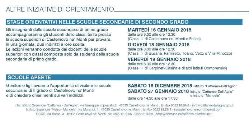 Il Salone dell’orientamento apre una serie di attività che hanno l’obiettivo di dare indicazioni e informazioni utili ai ragazzi dell’ultimo anno delle scuole medie sulla scelta della scuola superiore, una scelta sicuramente molto importante: ci sarà l’opportunità di compiere una stage orientativi direttamente nelle sedi scolastiche. Gli insegnanti accompagneranno gli studenti delle classi terze per provare, in una giornata, due indirizzi a loro scelta. Le lezioni verranno condotte dai docenti delle scuole superiori con classi composte solo da studenti delle scuole secondarie di primo grado. Si svolgeranno martedì 16 gennaio 2018 dalle ore 8.30 alle ore 12.30 per le classi III di Castelnovo Monti e Felina, giovedì 18 gennaio con stessi orari per le classi III di Busana, Ramiseto, Toano, Vetto e Villa Minozzo, venerdì 19 gennaio, ancora dalle 8.30 alle 12.30 per le classi di Carpineti-Casina e di altri Istituti Comprensivi. Infine sabato 16 dicembre e sabato 27 gennaio saranno giornate di “Scuole aperte” dalle 14.30 alle 17.30, con genitori e figli che avranno l'opportunità di visitare le scuole superiori e di chiedere chiarimenti sui vari indirizzi.