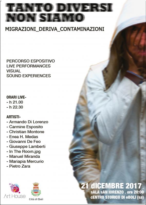 con il patrocinio del Comune di Eboli. "Tanto diversi non siamo. Migrazioni, deriva, contaminazioni": giovedì 21 dicembre nella Sala Concerti San Lorenzo, nel centro antico della città, si terrà una collettiva sul tema delle migrazioni.