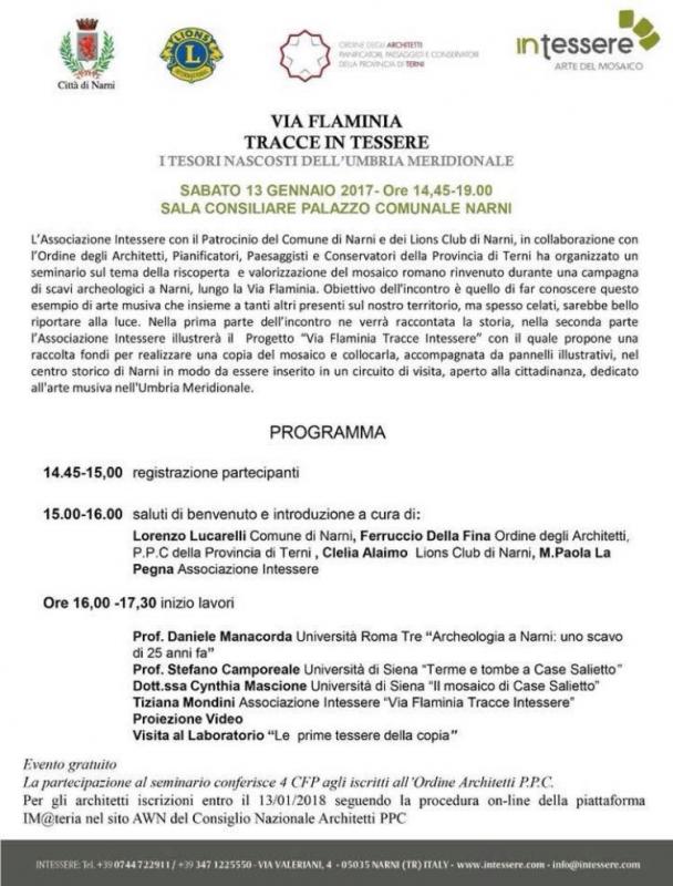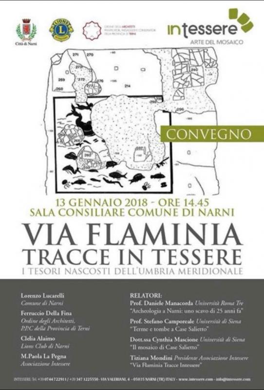 L’associazione Intessere con il patrocinio del Comune di Narni, in collaborazione con l’Ordine degli Architetti della Provincia di Terni, ha organizzato un convegno sul tema della riscoperta e valorizzazione del mosaico romano rinvenuto all’interno di un antico edificio termale lungo il diverticolo della Via Flaminia che collegava Narnia (Narni) a Interamna Nahrs (Terni).