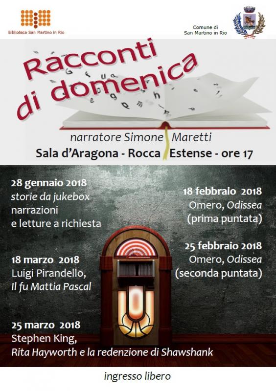 SAN MARTINO IN RIO – La grande letteratura animerà nelle prossime settimane la Biblioteca Civica di San Martino. Domenica 28 gennaio verrà presentata la prima edizione della rassegna “Racconti di domenica”: quattro domeniche, tra febbraio e marzo, durante la quali tramite narrazioni saranno presentati tre grandi classici della letteratura di tutti i tempi. E quindi ecco che nell'imponente Sala d'Aragona verranno raccontati prima “Il fu Mattia Pascal” di Luigi Pirandello, poi la grande letteratura horror contemporanea di Stephen King con “Rita Hayworth e la redenzione di Shawshank”, ed infine tra le mura della Rocca rivivrà il travagliato ritorno ad Itaca di Ulisse con due incontri dedicati all'Odissea.