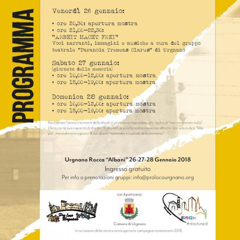 Per quest’occasione, sulla scia del buon riscontro avuto lo scorso anno, la Pro Loco di Urgnano propone la seconda edizione di «Memorie Da Auschwitz», patrocinato dal Comune di Urgnano, e che si terrà all'interno della Sala d’Armi del Castello Albani di Urgnano nei giorni 26, 27 e 28 gennaio 2018. Si tratta di un percorso artistico per fare memoria: installazioni artistiche, video arte, una mostra fotografica, letture e altri momenti condivisi che possano far riflettere tutta la popolazione ma in particolare le giovani generazioni, sul pericolo che ancora oggi il mondo corre affinché ”mai più” possano avvenire tali atrocità. Il percorso-mostra porta il visitatore a ricostruire il contesto dei luoghi (in particolare il campo di concentramento di Auschwitz”) e ciò che è stato l'olocausto, “creando emozioni” che possano alimentare il ricordo. Il progetto artistico della mostra, come nella prima edizione, è ad opera di Giovanni Bacis.