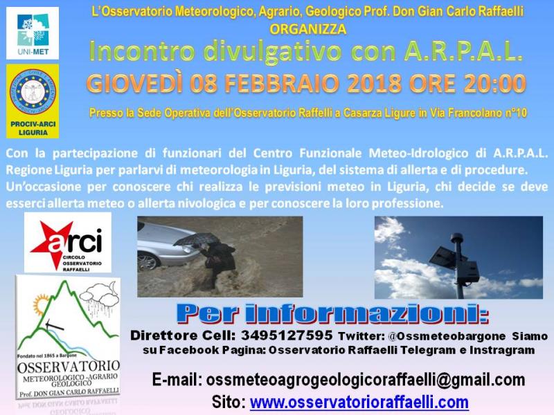 Come Osservatorio Meteorologico, Agrario, Geologico Prof. Don Gian Carlo Raffaelli organizza per giovedì 8 Febbraio 2018 ore 20:00 un incontro pubblico divulgativo a Casarza Ligure, presso la nostra sede operativa di Via Francolano n°10.