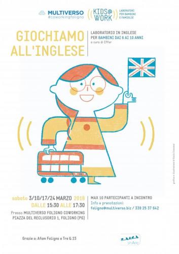 Si parte a marzo, con il primo laboratorio della serie Kids@work 2018: “Giochiamo all’inglese” laboratori in lingua inglese a cura di Effor presso Multiverso Foligno Coworking, tutti i sabati (di marzo) dalle 15:30 alle 17:30, quattro incontri da due ore (compresa la merenda).