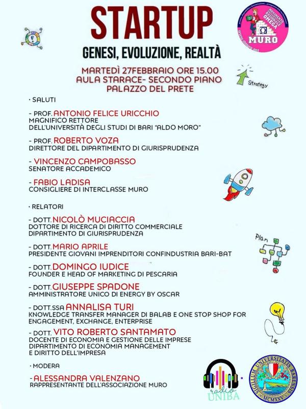 Convegno "STARTUP – GENESI, EVOLUZIONE, REALTÀ” – MARTEDÌ 27 FEBBRAIO ORE 15:00 AULA STARACE (SECONDO PIANO) – PALAZZO DEL PRETE - BARI.