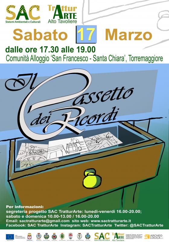 L’iniziativa ‘Il cassetto dei ricordi’ rientra nel ciclo di appuntamenti organizzati dal progetto SAC TratturArte - Alto Tavoliere, di cui il Comune di San Severo è ente capofila, finanziato con Delibera CIPE 92/2012 -A.P.Q. rafforzato “Beni e Attività Culturali” - FSC 2007/2013 - Scheda 49 - “Interventi materiali ed immateriali di valorizzazione dei beni di maggiore rilievo territoriale storico culturale”. Il progetto SAC TratturArte, partito lo scorso settembre 2017, proseguirà fino al 31 dicembre 2018 nei comuni sopra indicati, e si compone di una serie di iniziative culturali realizzate all'insegna di un approccio di tipo esperienziale per la valorizzazione, promozione e conoscenza del territorio dell'Alto Tavoliere, caratterizzato dal comune denominatore costituito dal Tratturo Regio Foggia – L’Aquila.