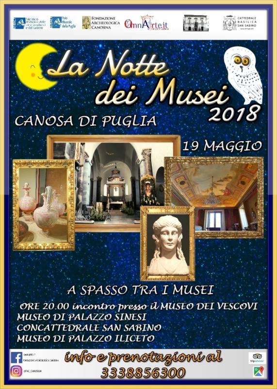 Il 19 Maggio p.v., anche Canosa di Puglia(BT), Città dell’archeologia, apre i portoni dei propri musei, grazie all’iniziativa della Società Cooperativa OmniArte.it, in collaborazione con il Mibact, la Fondazione Archeologica Canosina, al Museo archeologico di Palazzo Sinesi(sede del Polo Museale della Puglia) e la Concattedrale San Sabino. Questa nuova edizione prevede una passeggiata archeologica serale, dalle ore 20.00 alle ore 22.00, con la possibilità di visitare le mostre ospitate all’interno dei musei e non solo, ripercorrendo, così, la millenaria storia di Canusium.