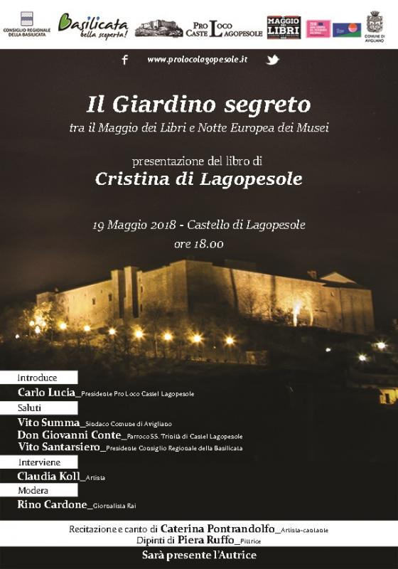 Inserita nella campagna nazionale “Il Maggio dei Libri”, il prossimo 19 Maggio 2018 si terrà la presentazione nella Cappella del Castello di Lagopesole del libro “Il Giardino segreto”, ultima opera della poetessa del sacro innografo Cristina di Lagopesole.