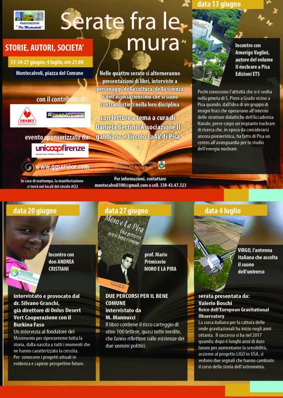 Quattro serate in cui si alterneranno presentazioni di libri, interviste a personaggi della cultura, della scienza e dell’associazionismo che si siano contraddistinti nella loro disciplina.