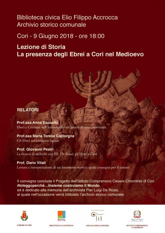 Sabato 9 giugno alle 18 nella biblioteca civica Elio Filippo Accrocca si parlerà di ‘Lezione di Storia. La presenza degli Ebrei a Cori nel Medioevo’: quale il significato di questa presenza nel millenario centro lepino, cosa essa ha ancora da dire alla Cori di oggi. Il convegno, voluto dall’istituto comprensivo Cesare Chiominto e dall’amministrazione comunale – assessorato alla Cultura, rappresenta una tappa nel percorso di riscoperta del territorio portato avanti dalla scuola ed è dedicato alla memoria dell’archivista Pier Luigi De Rossi, che molto si era occupato del tema oggetto dell’incontro e le cui ricerche sono state fondamentali nel lavoro dei ragazzi. Si ricorderà, dunque, la figura del compianto studioso corese prematuramente scomparso, al quale nell’occasione verrà intitolato l’archivio storico comunale di cui fu di fatto il creatore e per decenni il responsabile.