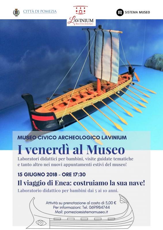 L'arrivo dell'estate porta a nuovi appuntamenti, che vi coinvolgeranno per farvi vivere il Museo secondo nuove ed insolite prospettive: per questo vi aspettiamo per i "Venerdì al Museo Lavinium": l'apertura straordinaria del Museo il venerdì pomeriggio sarà l'occasione per proporvi laboratori didattici per bambini, visite guidate tematiche