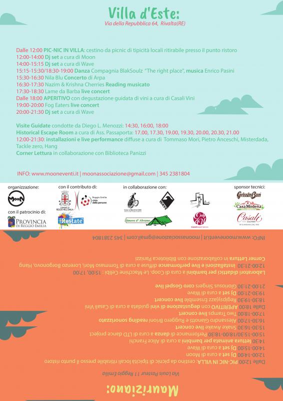 Dalle 12.00 il pubblico potrà gustare il pranzo nel parco della villa: un luogo magico immerso nel lago popolato da cigni e pavoni, con l'accompagnamento musicale curato dall'Associazione Wave. Si susseguiranno poi varie performance artistiche che animeranno la giornata: alle 15.15 e alle 18.30 i danzatori Francesca Misceo e Francesca Galli della compagnia BlackSoulz metteranno in scena lo spettacolo “The right place” su musiche di Enrico Pasini e regia di Elisa Balugani; alle 15.30 concerto dell'arpista Nila Blu; alle 16.30 i Nazim & Krishna Cherries sul palco: reading di poesie dell'autore Nazm Comunale accompagnato dal flauto bansuri di Jacopo Pacifico; alle 17.30 il gruppo bolognese “Lame da barba” divertirà il pubblico con le sue musiche tradizionali mediterranee contaminate da sonorità contemporanee; alle 19.00 il concerto live del gruppo blues “Fog Eaters”; chiuderà l'evento apertitivo con Dj set. Durante tutta la giornata sarà possbilie osservare le installazioni interattive ed i live painting degli artisti Tommaso Mori, Pietro Anceschi, MisterDada, Tackle Zero, Hang.