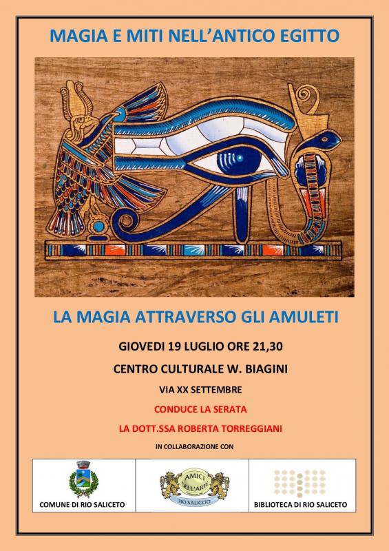 Giovedì 19 luglio 2018, alle ore 21,30, presso il Centro Culturale W. Biagini di RIo Saliceto (RE) (Via XX Settembre) si tiene la conferenza dal titolo "Magia E Miti Nell'antico Egitto - La Magia Attraverso Gli Amuleti".