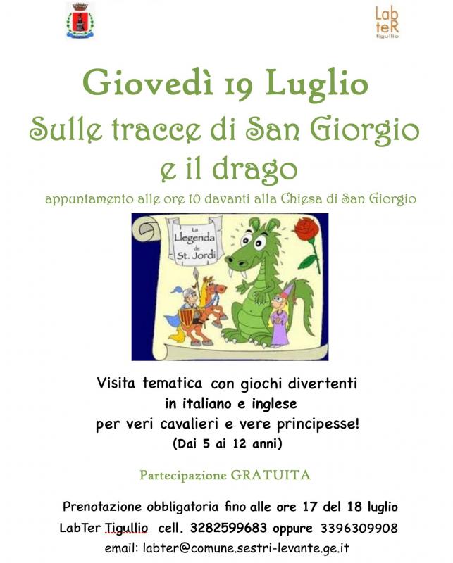 Il LabTer Tigullio, in collaborazione con il Comune di Moneglia, propone per giovedì 19 luglio un’originalissima attività per i bambini e per le loro famiglie “Sulle tracce di San Giorgio e il drago”.