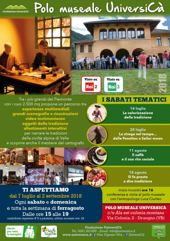 Prosegue l'apertura stagionale del Polo museale UniversiCà di Druogno (VB) nella graziosa Valle Vigezzo. Si tratta di uno dei più grandi musei del Piemonte dedicati alla civiltà alpina e alla montagna. In un complesso di oltre 2500 mq, è situato nell'ala est dell'ex colonia montana e presenta un Museo Vivo sulla civiltà alpina, sulle arti, sugli antichi mestieri e sulle tradizioni delle valli ossolane. Il percorso propone un allestimento in stile “teatrale”, nel quale ci si troverà immersi in numerosi saloni che propongono, tra scenografie, proiezioni, experience interattive, oggetti della tradizione, la ricostruzione “viva” ed emozionale degli ambienti montani. Il polo museale ideale per tutta la famiglia aprirà alle ore 15 ed è raggiungibile in auto o con la ferrovia Vigezzina.