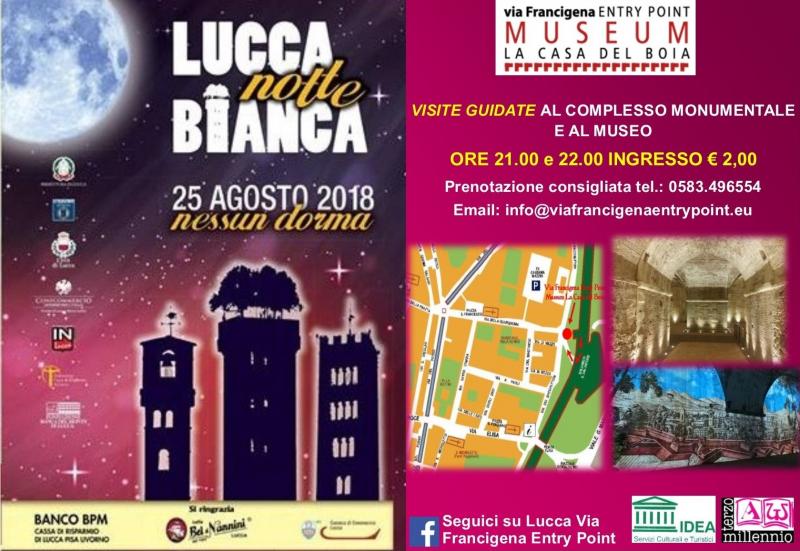 Nel programma della Notte Bianca di Lucca che si svolge il 25 agosto 2018, il Museo Via Francigena Entry Point organizza due visite guidate, alle ore 21.00 e 22.00, al Complesso monumentale e al museo, ingresso € 2,00.