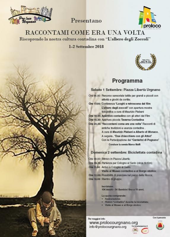 La Pro Loco Urgnano, in collaborazione con la Pro Loco Cologno al Serio, organizza: “Raccontami come era una volta”, un viaggio alla riscoperta della nostra cultura contadina attraverso il film “L'Albero degli Zoccoli”, nel 40° dell'anniversario dalla Palma d'Oro di Cannes. Sabato 1 e domenica 2 settembre, i due borghi situati nel cuore della pianura bergamasca riassaporeranno ricordi, sapori, sguardi, odori, esperienze di un passato rurale che, come acqua alla mano, scivola via con lo scorrere del tempo, ma che appartiene al nostro DNA e merita di essere custodito.