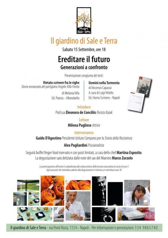 Si terrà a Napoli sabato 15 settembre, alle ore 18, presso la sede dell’associazione ‘Il giardino di Sale e Terra’, in via Ponti Rossi 113 H, l’incontro “Ereditare il futuro, generazioni a confronto”.