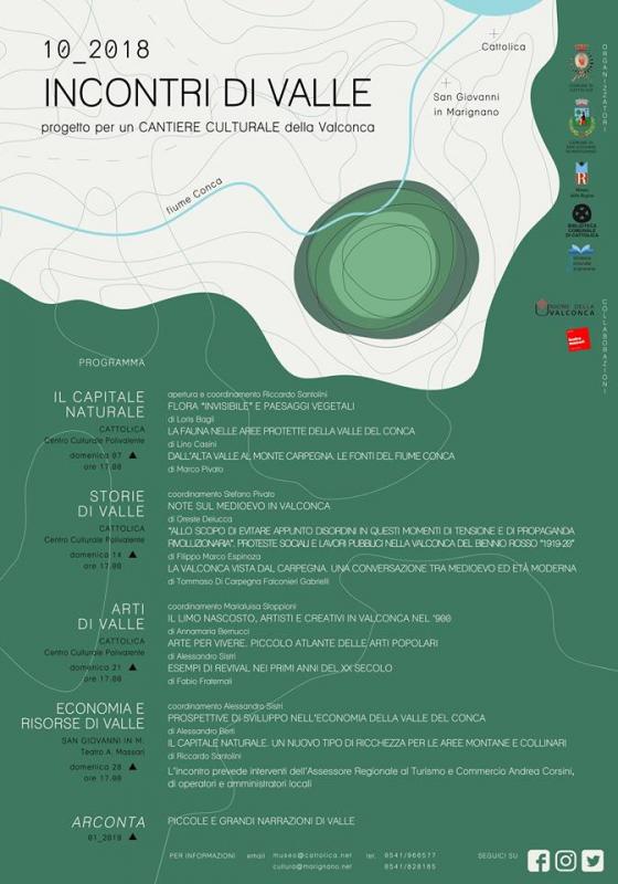 L'Assessorato alla Cultura del Comune di Cattolica (Museo della Regina e Centro Culturale Polivalente) e l'Assessorato alla Cultura del Comune di S. Giovanni in Marignano (Biblioteca Comunale S. Giovanni in Marignano e Teatro “A. Massari”) congiuntamente, sono riusciti a dare vita ad un vero e proprio “cantiere culturale” dedicato alla Vallata, un ciclo di appuntamenti, quattro, dedicati a storia, ambiente naturale, arti ed economia, ed ispirati a “Natura e Cultura nella Valle del Conca”, convegno di studi del 1982 che, per primo, ha rappresentato storicamente, la ricerca di un’identità di valle.