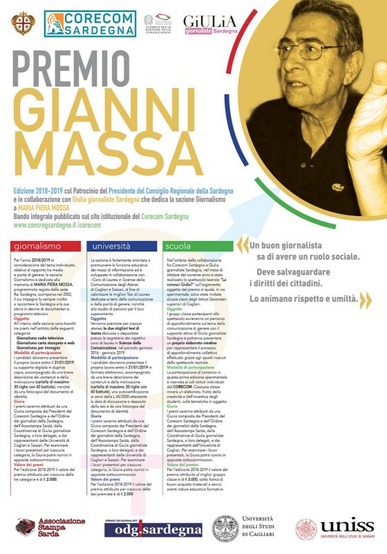 In questo contesto il CORECOM, il Comitato per le comunicazioni della Regione autonoma della Sardegna presieduto da Mario Cabasino, preposto alla promozione di adeguate iniziative affinchè il principio del pluralismo dei contenuti e dei mezzi informativi trovi effettiva applicazione sul territorio regionale, per le iniziative dell’annualità 2018-19, in collaborazione con Giulia giornaliste Sardegna (Giornaliste Unite Libere Autonome) coordinata da Susi Ronchi, ha indetto la prima edizione del Premio CORECOM Sardegna “Gianni Massa” dedicato al rapporto tra media e parità di genere, intitolato ad uno dei protagonisti della storia del giornalismo in Sardegna che si è distinto anche per il suo profondo impegno professionale e civile, scomparso nel 2015 a 79 anni. <>>, commenta Mario Cabasino, presidente del Corecom.