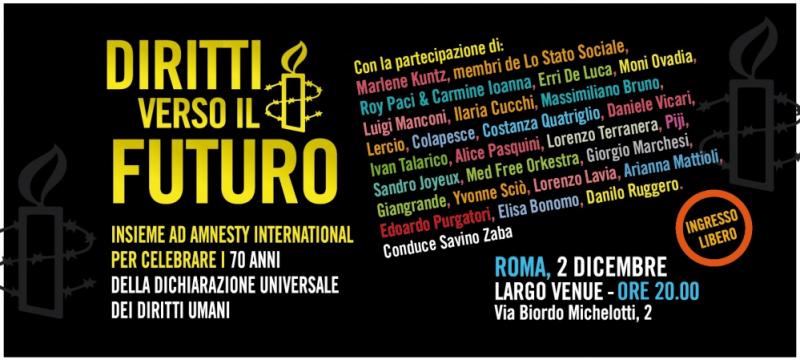 A Roma il 2 dicembre ci sarà un evento di particolare importanza, organizzato direttamente da Amnesty International Italia. Sarà “Diritti verso il futuro”, in programma a Largo Venue (via Biordo Michelotti 2). Una serata di musica, testimonianze, letture e riflessioni, con Marlene Kuntz, membri de Lo Stato Sociale, Roy Paci& Carmine Ioanna, Erri De Luca, Moni Ovadia, Luigi Manconi, Ilaria Cucchi, Colapesce, Massimiliano Bruno, Lorenzo Terranera, Lercio, Daniele Vicari, Piji, Giangrande, Elisa Bonomo e Danilo Ruggero. L’appuntamento, a ingresso gratuito, sarà condotto da Savino Zaba di RadioRai.