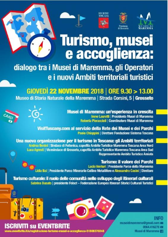 “Turismo, musei e accoglienza. Dialogo tra i Musei di Maremma, gli operatori e i nuovi Ambiti Territoriali Turistici” è il titolo di una convegno che si svolgerà giovedì 22 novembre alle ore 9.30 al Museo di Storia Naturale della Maremma, strada Corsini 5, a Grosseto. Un evento organizzato dalla Rete Musei di Maremma insieme alla Regione e alla Provincia, che si prefigge lo scopo di creare un momento di incontro e riflessione che coinvolga tutti i soggetti che in Maremma lavorano su più livelli nel settore turistico e culturale. In questo contesto i Musei di Maremma, che riuniscono 54 tra musei, aree archeologiche, spazi espositivi pubblici e privati della Provincia di Grosseto, racconteranno chi sono e quali strumenti sono stati messi in campo in questi anni mettendo questi dati a disposizione di chi ha interesse ad utilizzarli. Altro tema che sarà affrontato quello dei parchi e del loro ruolo ed esperienze nel campo turistico. Inoltre dopo la recente costituzione dei nuovi Ambiti territoriali turistici, che in Maremma sono tre (Maremma area Nord, Maremma area sud e Amiata, la conferenza rappresenterà un momento per fare il punto sullo stato di avanzamento di questa riforma e quale sarà il rapporto tra promozione turistica locale e le politiche regionali. Tra i relatori della conferenza, divisa in varie sessioni tematiche, ci saranno Irene Lauretti presidente della Rete Musei di Maremma, la coordinatrice Roberta Pieraccioli, Paolo Chiappini direttore di Fondazione Sistema Toscana, Andrea Benini sindaco di Follonica capofila dell’Ambito Turistico Maremma Toscana area Nord, Luca Agresti vicesindaco di Grosseto capofila Ambito Turistico Maremma Toscana area Sud, Lucia Venturi presidente del Parco della Maremma, Lidia Bai presidente del Parco Minerario Colline Metallifere e la direttrice Alessandra Casini e infine Sabrina Busato presidente Feisct (Federazione Europea Itineari Storici Culturali Turistici).