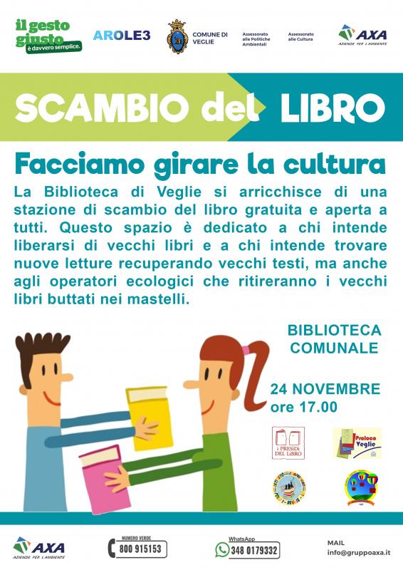 La Biblioteca di Veglie si arricchisce di una stazione di scambio del libro gratuita e aperta a tutti i cittadini, grazie all'impegno del Comune di Veglie - Assessorato alle Politiche Ambientali e Assessorato alla Cultura, e di Axa Aziende per L'Ambiente, gestore del servizio di igiene urbana, con la collaborazione di Presidio del Libro, Pro Loco Veglie e degli Istituti Comprensivi Polo 1 e 2.