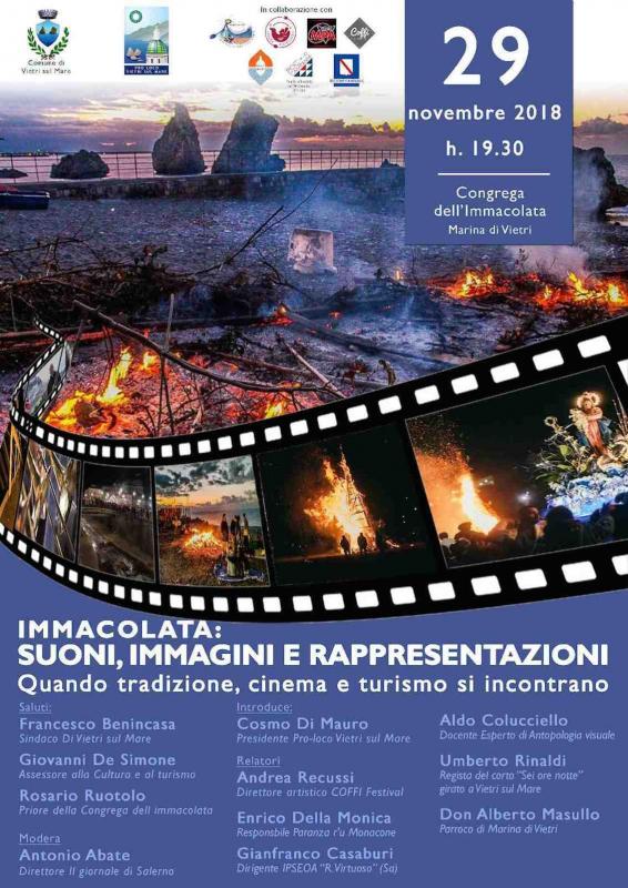 In attesa della Festa dell'Immacolata, che dà il via al programma natalizio di Vietri sul Mare, la Proloco di Vietri sul Mare, presieduta da Cosmo Di Mauro, in preparazione ai riti legati al culto della Madonna, ha organizzato l'incontro "Immacolata: suoni, immagini e rappresentazioni. Quando tradizione, cinema e turismo si incontrano", che si terrà giovedì 29 novembre, alle ore 19.30, presso la sede dell'antica Congrega dell’Immacolata (località San Francesco adiacente chiesa) alla frazione Marina della cittadina costiera, al termine della Santa Messa, dell'intronizzazione e dell'inizio novena. All'evento parteciperanno il professor Enrico Della Monica, presidente della neo costituita associazione “A paranza ru munacone”, che ha riportato a Marina il festival della tammorra “Marcina Etnica” che avrà luogo i giorni 7-8-9; Andrea Recussi direttore del Coffi Festival, importante iniziativa legata al mondo dei cortometraggi, che si svolgerà i giorni 14-15-16 per la prima volta a Vietri sul Mare, il festival è diretto da Andrea Recussi; Cosmo Di Mauro che presenterà il cortometraggio, ambientato nella notte dell’Immacolata, dal titolo “Sei ore notte”, diretto dal regista Umberto Rinaldi, a cura della Hich 2, importante società di produzione cinematografica e fortemente voluto dalla Proloco. Dal punto di vista antropologico sarà il professor Aldo Colucciello, antropologo ed esperto di culture visive, ad intervenire sul tema dei riti religiosi come espressione del territorio, eventi che aumentano le potenzialità attrattive dal punto di vista turistico e quindi dell’accoglienza, come spiegherà nel coso dell'incontro il dirigente scolastico dell’Istituto Alberghiero di Salerno Gianfranco Casaburi. L’aspetto strettamente legato alla fede sarà invece curato dal sacerdote di Marina don Alberto Masullo. I diversi interventi saranno moderati dal direttore del Giornale di Salerno Antonio Abate, già socio proloco. L'evento è organizzato nell'ambito della programmazione "Vietri Cultura", che gode del finanziamento Poc 2014-2020- linea strategica 2.4 “Rigenerazione urbana, politiche per il turismo e cultura”